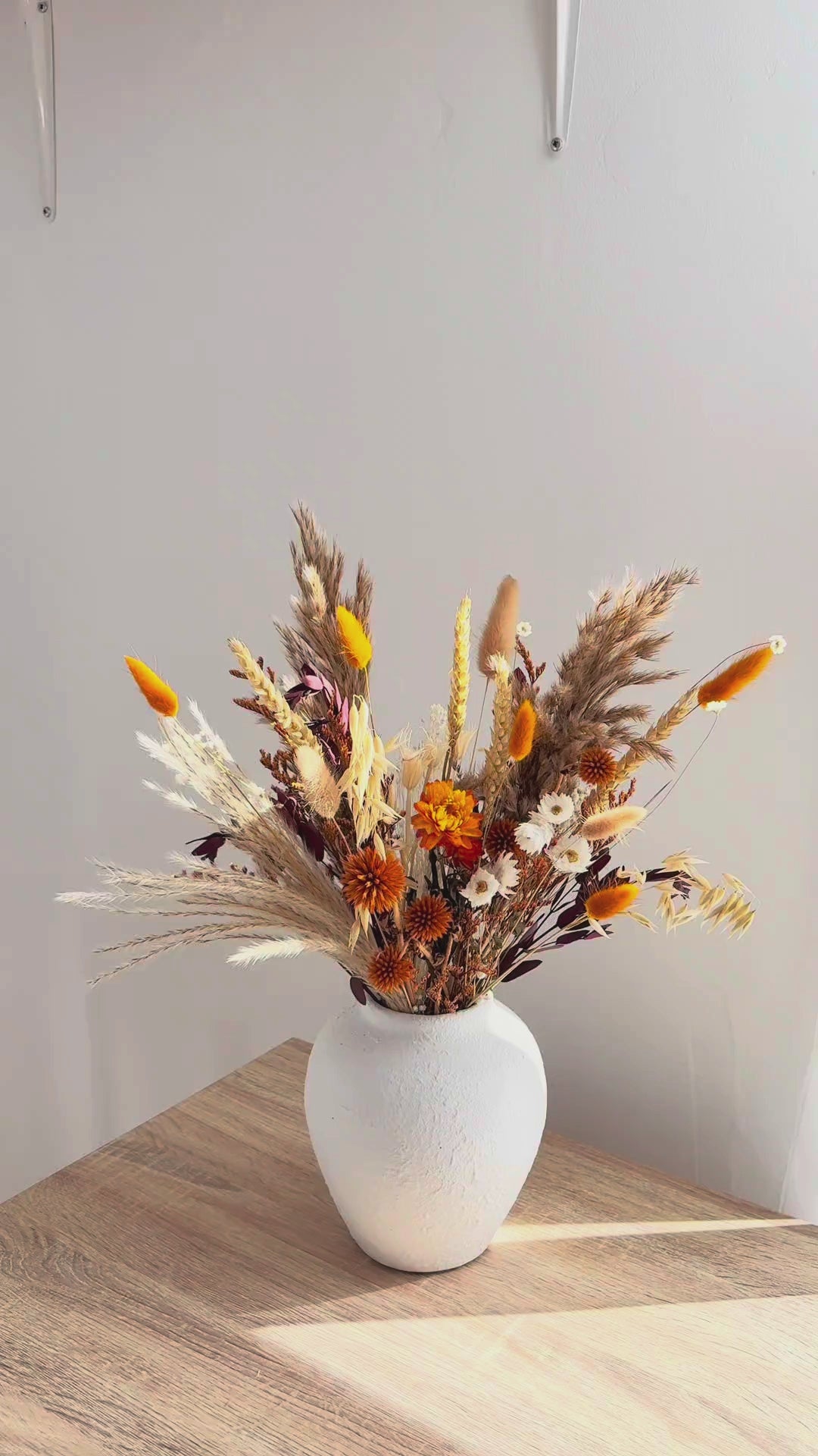 With mix of over 10 types of natural autumn vibe dried flower blooms including pamper grass, preserved eucalyptus, wheat stalks, rabbit / bunny tails, baby's breath, and more. This autumn vibe dried bouquet bunch will last 3-5 years (even longer!) with little to no maintenance (easy to handle!), making it a stunning gift.