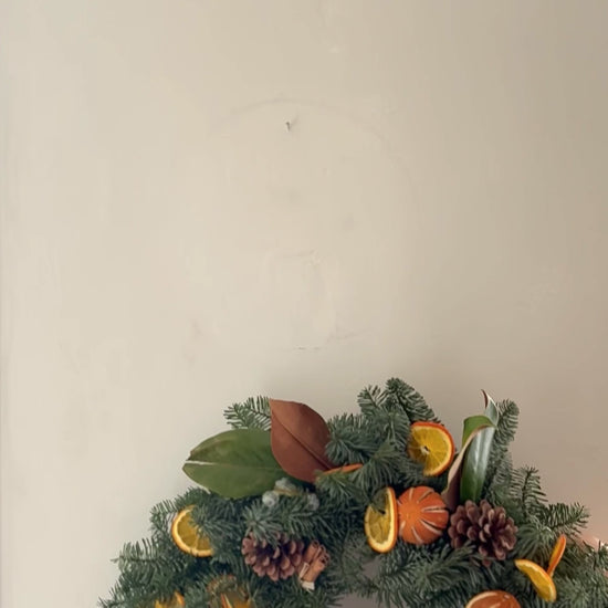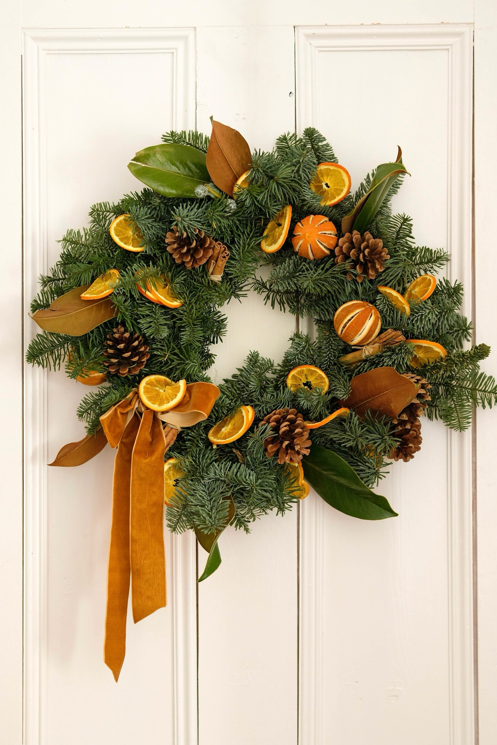 Bring the rich, authentic scent of the season to your entryway with our handcrafted festive orange fruit christmas wreath. Built upon a lush base of fresh christmas wreath blue pine, our arrangement is handmade from a range of complementary natural elements.