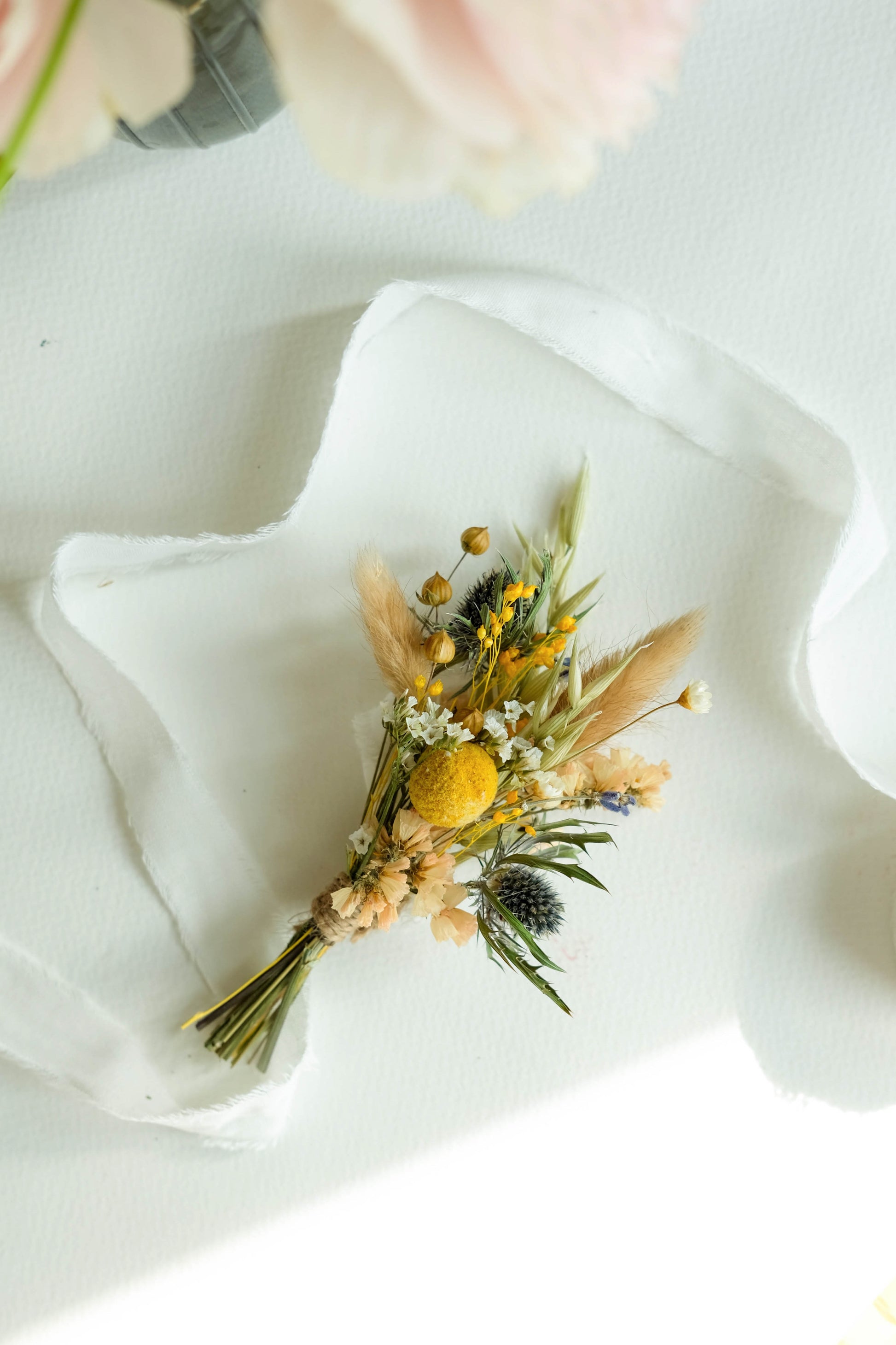 A charming, textured buttonhole that captures the feel of a rustic countryside wedding. This boutonniere design features a bright yellow billy ball (craspedia) and blue thistle, accented with dried oats and soft bunny tails. The buttonhole has a wonderful "earthy" feel. It’s a perfect choice for couples wanting a relaxed, natural aesthetic with a subtle pop of color.