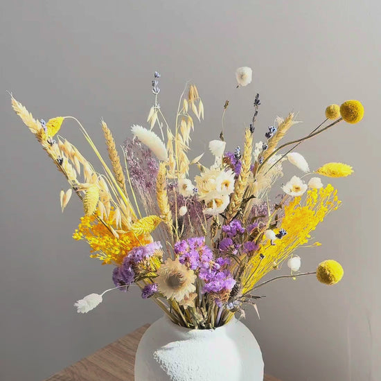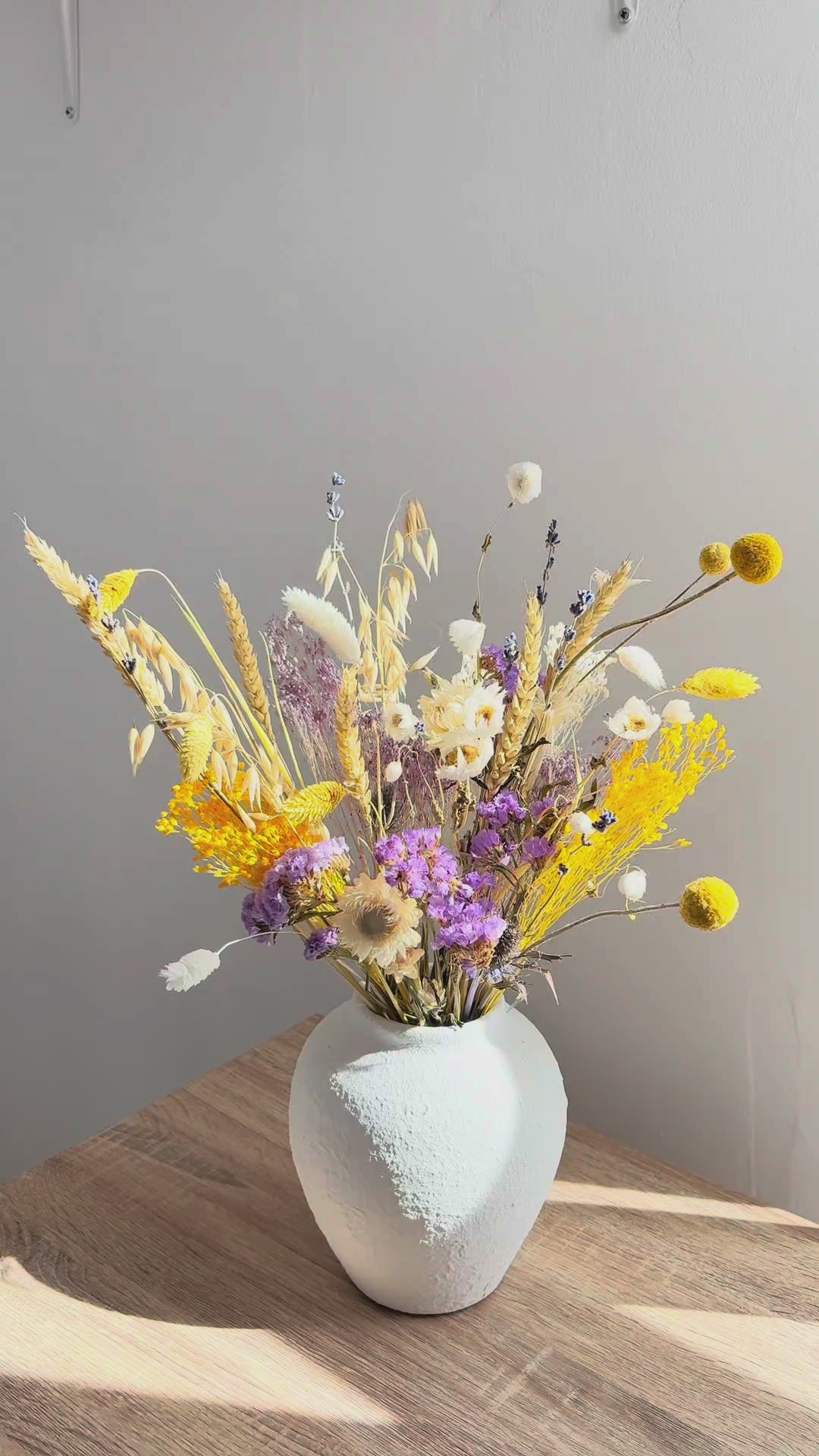With mix of over 10 types of natural yellow, purple, and lilac colour dried flower blooms including lavender, yellow billy buttons, wheat stalks, statice, and more. This dried bouquet bunch will last 3-5 years (even longer!) with little to no maintenance (easy to handle!), making it a stunning gift.